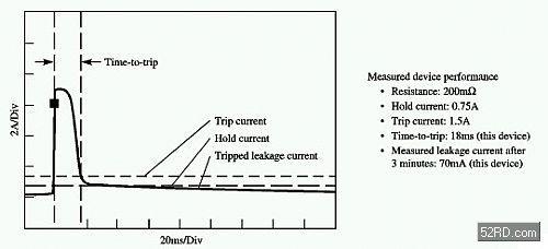 動(dòng)作時(shí)間是PPTC在故障情況下對(duì)動(dòng)作速度的特性所進(jìn)行之描述。在小功率應(yīng)用條件下,動(dòng)作時(shí)間是關(guān)鍵因素,因?yàn)樵谡麄€(gè)系統(tǒng)的電壓降低或減弱且系統(tǒng)性能受到影響之前,小型電源維持在短路電流而不受損的時(shí)間可能很短。動(dòng)作時(shí)間數(shù)值與元件的設(shè)計(jì)、元件的大小和工作電流性能有很大關(guān)系,且還要考慮到電路板設(shè)計(jì);即電路板上較寬的連線或較大的焊接器等同于散熱器,均可增加動(dòng)作時(shí)間。縮小焊接器的尺寸,選擇較低的工作電流能夠改善動(dòng)作時(shí)間性能。