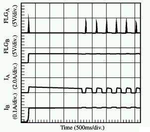 PowerSwitch電源開關(guān)元件檢測(cè)到了通道A的故障,并開始限制電流。而只有在通道A,PowerSwitch將真正地開始ON/OFF循環(huán)週期直至故障現(xiàn)象消失。而通道B上的連續(xù)電流處于技術(shù)規(guī)范之內(nèi),其工作保持不受影響。