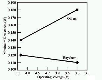 在USB的設(shè)計(jì)中,另一項(xiàng)重要的考慮因素是隨著電壓的下降,電阻值也會(huì)下降。隨著供電電壓的下降,電壓降問題顯得更加突出。一般來說,電壓下降將導(dǎo)致電源開關(guān)的導(dǎo)通電阻增加,這是一種不期望的特性。但Raychem的PowerSwitch元件的電阻卻能夠隨著供電電壓的下降而下降,因而避免這不利特性。如圖7所示,在匯流排電壓較高時(shí),PowerSwitch能夠減少輸出電流值,提升電源的效率和電池的使用壽命。在匯流排電壓較低時(shí),PowerSwitch兩端的電壓降也會(huì)降低,這樣USB功能就能繼續(xù)工作一段更長(zhǎng)的時(shí)間。