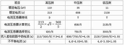 實(shí)例:一臺(tái)三相三繞組降壓變壓器,容量Se=40.5MVA,電壓110±2×2.5%kV/385±2×2.5%kV/11kV,接線方式:Ydd11-11,變壓器額定電流:213A/608A/2130A。主變差動(dòng)保護(hù)采用BCH-2型差動(dòng)繼電器。基本計(jì)算如表1所示,已確定110kV側(cè)為基本側(cè)。