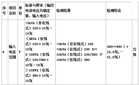 (2)寬輸入電壓范圍。輸入電壓允許范圍為+15%~-30%,在中大功率UPS當中還未見到另一品牌UPS經過權威單位檢測達到此指標,如附表所示。