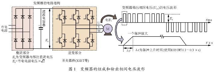 變頻器主要由把交流市電整流成直流的整流器、平滑電壓脈動的電容器、6 個開關(guān)器件構(gòu)成的逆變器所組成。如圖1 所示,逆變器部分輸出由改變脈沖寬度(PWM 波)形成的等效正弦波交流電壓去驅(qū)動電機(jī)。近幾年的變頻器為了使電機(jī)低噪音化,逆變部分的開關(guān)器件采用IGBT進(jìn)行著高速開關(guān)動作。因此,在PWM 波的每個脈沖上升和下降時,即開關(guān)時間以非常短的時間駐t=0.1~0.3 滋s切換著的時候,使逆變器內(nèi)部的直流電壓Ed(400 V電力系統(tǒng)用逆變器的Ed=600 V左右)因切換所形成的電壓變化率dv/dt變得很大,這是產(chǎn)生微浪涌的主要根源之一。