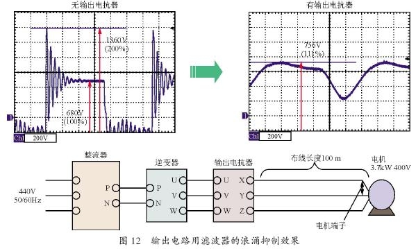 圖12 顯示了供電電源440 V,功率為3.7 kW的變頻器供電給電機(jī)(3.7 kW,400 V),在接線長度為100 m時、測量電機(jī)接線端子U-V 之間的微浪涌電壓的抑制效果。在沒有輸出濾波器的情況下,微浪涌電壓達(dá)到1 360 V,相當(dāng)于變頻器內(nèi)部直流電壓680V 的200%。有輸出濾波器的時候,頂峰值電壓是756 V、相當(dāng)于變頻器器內(nèi)部的直流電壓680 V的111%,它和沒有輸出濾波器的頂峰電壓差距有604 V,抑制效果達(dá)89%。