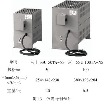 圖13 所示為浪涌抑制組件的外觀。和輸出濾波器相比,浪涌抑制組件是小型化的產(chǎn)品。其技術(shù)指標(biāo)為相間的微浪涌電壓1 000 V以下,防護(hù)等級為IP20。浪涌抑制組件是對變頻器的容量不需要選擇,而接線距離需要選擇的產(chǎn)品。另外,接線方法非常簡單,只需要把浪涌抑制組件的輸入電纜接到電機(jī)接線端子U、V、W上。