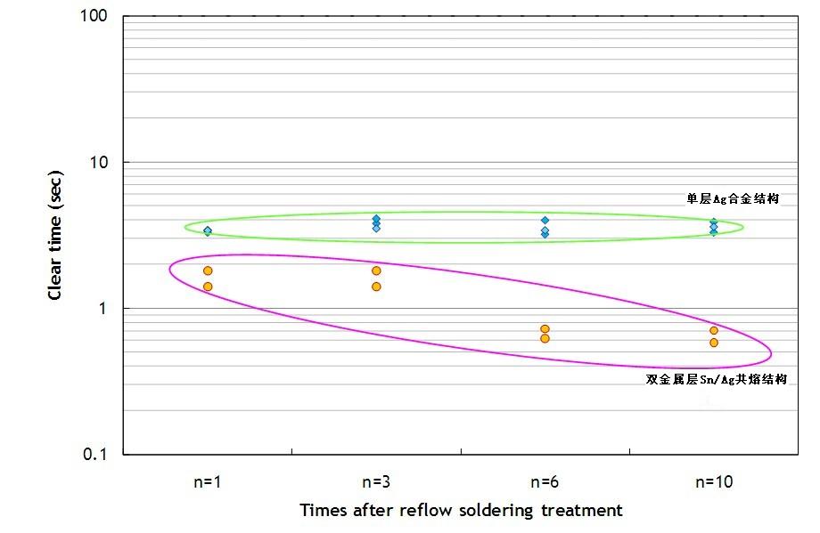 單層Ag合金結(jié)構(gòu)的保險絲即使經(jīng)過多次高溫熱處理,仍可以維持較穩(wěn)定的熔斷時間。但是雙層Sn/Ag共熔結(jié)構(gòu)的保險絲,其熔斷時間有明顯變快的趨勢。