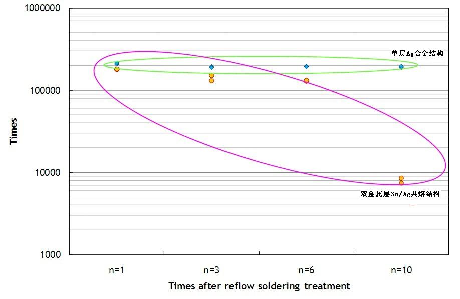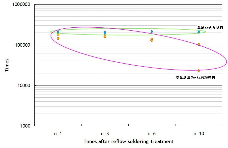 單層Ag合金結(jié)構(gòu)的保險絲即使經(jīng)過多次高溫熱處理,仍可以維持一定的耐脈沖能力,承受脈沖次數(shù)都可達十萬次以上。但是雙層Sn/Ag共熔結(jié)構(gòu)的保險絲,其承受脈沖能力有明顯下降的趨勢,在經(jīng)過10次回流焊錫爐熱處理后,承受脈沖次數(shù)就會下降到十萬次以下。