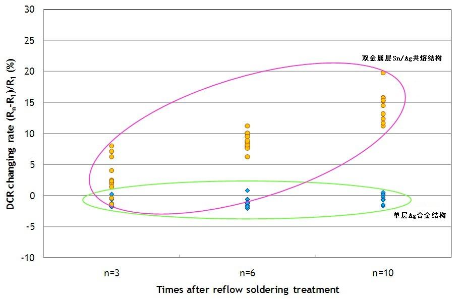 單層Ag合金結(jié)構(gòu)的保險絲即使經(jīng)過多次高溫熱處理,其冷阻抗變化很小。但是雙層Sn/Ag共熔結(jié)構(gòu)的保險絲,其冷阻抗有明顯變高的趨勢(約升高10~20%),且變異也較大。