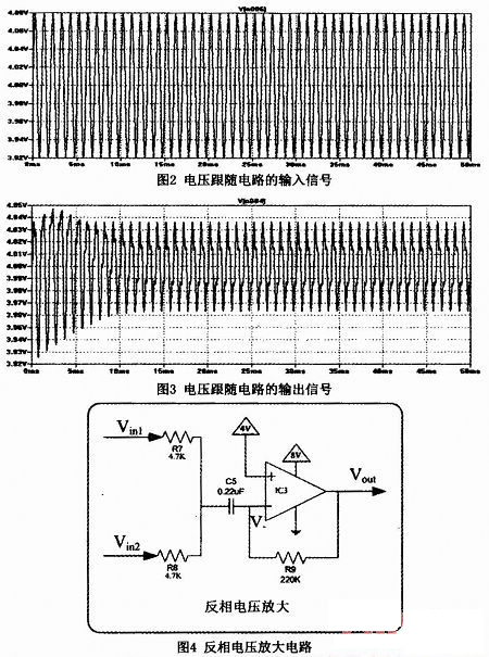 在電壓跟隨電路中,運放IC1和IC2起到了電壓跟隨器的作用,將正信號輸入端疊加了直流偏置的信號,無變化地傳到下一級。運放電壓跟隨器中輸入阻抗很大,輸出阻抗很小。由于輸入阻抗很大,輸入的電壓幾乎無損失地傳遞給運放,而輸出阻抗很小,又使輸出的信號幾乎全部傳遞給后面的電路。運放起了很好的緩沖作用,隔斷了后級對輸入信號的影響。