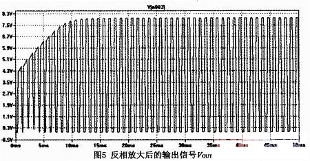 C5是防止低頻噪聲干擾的對策,加了C5后,反相放大器的放大倍數R9/R7中,R9仍為(220k Ω),R7則變成由C5(0.22 μF)和4.7kΩ合成的。電容的容抗為1/(j*w*C),對于低頻信號容抗很大,對于高頻信號接近短路,這樣對于低頻信號放大倍數較大幅度減小,而對于高頻信號放大倍數幾乎不變,起到了抑制低頻干擾信號的作用,防止了誤觸發。圖5是該電路對80mV信號放大后在PSPICE中仿真的輸出: