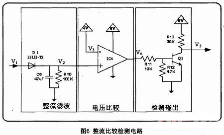 本電路共6部分組成:電源電路、電壓跟隨電路、電壓反相放大電路、低通濾波電路、比較電路、檢測輸出電路。電路圖如圖1所示: