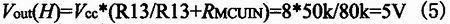 當比較器輸出低電平,Q1截止,8V通過R13與微控芯片(MCU)相應端口的輸入阻抗RMCUIN進行分壓,通常MCU相應端口的輸入阻抗RMCUIN≈ 50kΩ,則輸出高電平可以由如下計算得到: