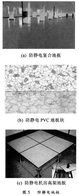 (4)防靜電地板:防靜電地板也有多種,按時效性分,有永久性和臨時性;按材料分有導電橡膠、PVC、導電陶瓷等;按鋪設方式分,有地面直接鋪設的和架空的活動地板。可根據實際需要和成本決定。如需要在地面走多種電纜、管道的環境如計算機房選擇架空鋪設的活動地板比較好。圖5是一些防靜電地板。