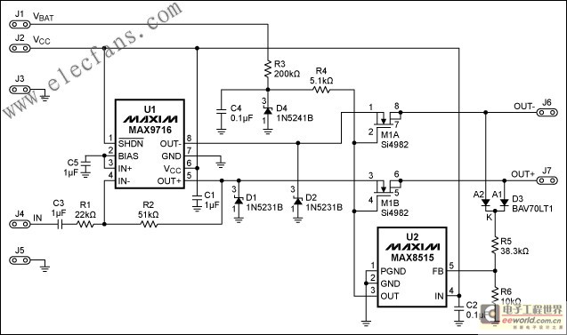 一個雙N溝道MOSFET斷開在回答有關(guān)任何輸出高電壓狀態(tài)下從線束放大器輸出。 MOSFET管(M1A及數(shù)M1B)一般上,用自己的驅(qū)動11V的齊納二極管的(4點)及其約11V的偏置元件。這種雙二極管D3提供了一個在每個輸出直流電壓二極管或連接,從而產(chǎn)生電壓,控制分流穩(wěn)壓器U2樂隊(MAX8515)輸出。所示的電路U1的保護,一個1.4W功率AB類放大器(MAX9716)以上(聲音警告和汽車的司機的跡象)中提到的應(yīng)用場合。