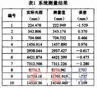 在實際測量中,利用組合測尺頻率先后進行兩次測量。第一次取主振信號頻率為52MHz,本振信號頻率為51.99MHz;第二次取主振信號頻率為51MHz,本振信號頻率為50.99MHz。對應于混頻后信號頻率為10kHz。FPGA中鑒相高速計數脈沖頻率為50MHz?;谝陨蠀担瑢Χ喽喂饫w進行測量。兩次測量的結果進行分析比較,可得到測量值。被測光纖的實際光程已由精密反射儀通過光學方法進行標定。測量結果如表1所示。