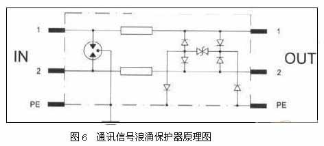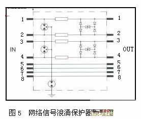 BAx系列信號浪涌保護器是專為通過雙絞線進行信號傳輸的設備而設計,以保護其避免遭受感應過電壓和操作過電壓的損害。該浪涌保護器輸入、輸出采用RJ45公/母于接頭串聯保護。網絡信號浪涌保護器原理圖見圖5所示。