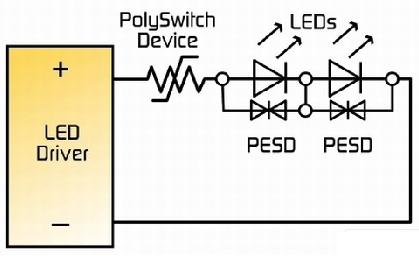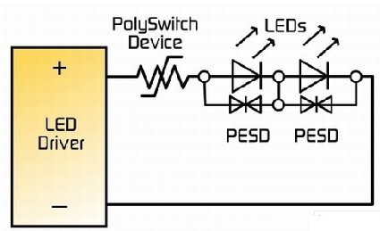 電源線耦合電壓瞬變和浪涌也可以降低LED的預期使用壽命,許多的LED驅動器容易受到不合適的DC電壓水平和極性的破壞。LED驅動器的輸出也可能被短路破壞或者摧毀。大多數LCD電視應用的LED驅動器包括內置安全裝置,包括熱關閉以及開路、短路LCD檢測。然而,可能還需要另外的過流保護元件以幫助保護集成電路(IC)以及其它敏感的電子元件。PolySwitch元件也可以被用來幫助防止當監測器的冷卻口被堵塞時可能發生的熱失控情況。由于其具有對溫度過高的情況有檢測和反應的能力,一個安裝合適的PolySwitch元件可以在LCD沒有足夠電壓運行的情況下中斷電流。