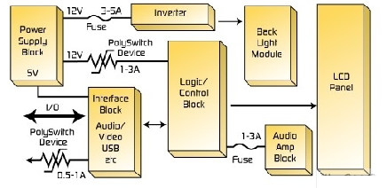 圖3顯示了在LCD電視監測器中PolySwitch元件可以安放的位置,以幫助提供過電流保護。為了充分發揮PolySwitch元件的影響,可以將其和金屬芯電路板或者LCD散熱片熱結合在一起。如果LCD沒有內置的ESD保護,可以向ESD并聯一個PESD保護元件,以幫助避免由ESD電壓浪涌造成的破壞。