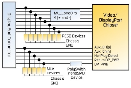 圖4. 典型的運用MLV元件, PESD抑制元件以及PolySwitch過電流保護元件的顯示端口電路保護設計