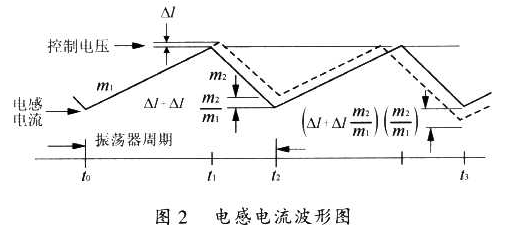 在圖l所示的電路中,當電源的占空比大于50%,或變壓器工作在連續電流條件下時,整個電路就會產生分諧波振蕩,引起電源輸出的不穩定。圖2表示了變壓器中電感電流的變化過程。沒在t0時刻,開關開始導通,使電感電流以斜率m1上升,該斜率是輸入電壓除以電感的函數。t1時刻,電流取樣輸入達到由控制電壓建立的門限,這導致開關斷開,電流以斜率m2衰減,直至下一個振蕩周期。如果此時有一個擾動加到控制電壓上,那么它將產生一個△I,這樣我們就會發現電路存在著不穩定的情況,即在一個固定的振蕩器周期內,電流衰減時閘減少,最小電流開關接通時刻t2上升了△I+△Im2/m1,最小電流在下一個周期t3減小到(△I+△Im2/m4)(m2/m1),在每一個后續周期,該擾動m2/m1被相乘,在開關接通時交替增加和減小電感電流,也許需要幾個振蕩器周期才能使電感電流為零,使過程重新開始,如果m2/m1大于l,將會不穩定。因此,圖l所示的電路在某狀態下存在著一定的失穩隱患?! ?/p>
