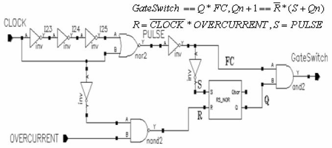 控制邏輯模塊如圖4 所示,該模塊直接控制LDMOS 的開關。PULSE 信號的上升沿對應是CLOCK 時鐘的開始,PULSE 信號與時鐘CLOCK 的關系如圖9 所示。當發生過流時,OVERCURRENT信號為低,觸發器R 端為高,Q 為低,GateSwitch 信號為低,關斷LDMOS,從而實現過流保護功能。