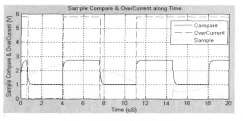 對圖3 進行電路仿真,電源電壓VCC 為5.8 V,LDMOS 漏端檢測電壓在10~50 V 之間,柵端電壓脈沖頻率為132 kHz,占空比為60%的方波,SPICE仿真條件設置為VCC=5.8 V,V (Detect)= SIN(30,20,50k),V (Gate)=PULSE(0,5.8,0.5u,0.5u,0.5u,3u,7u),仿真結果如圖8 所示。在1.26 uS~4.17 uS 和8.25 uS~11.2 uS 這兩個采樣區間內,采樣電壓V(Sample)較比較電壓V(Compare)大,輸出為低電平(過流保護,低電平有效);在15.2 uS~18.2 uS 采樣區間內,采樣電壓V (Sample) 較比較電壓V(Compare)小,輸出為高電平,對應不發生過流情況;其他時間段內柵電壓處于低電平,對應LDMOS處于關斷態,不可能發生過流,故過流輸出信號OverCurrent 為高電平。仿真結果表明,該電路確實能很好地實現過流保護的功能。