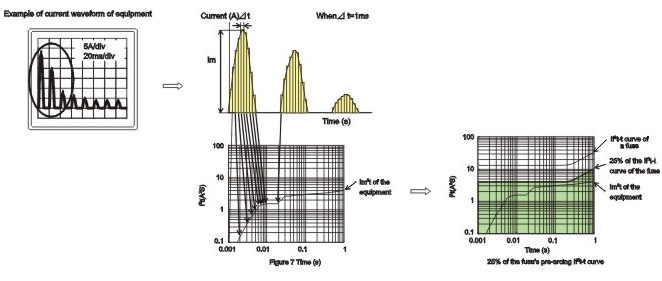 由于開關電源的出現,使得線路中的浪涌電流變得復雜,多變,不同的浪涌電流或工作電流波形產生的能量是不同的,電路設計者要了解回路中出現的浪涌電流或工作電流的波形,以適當地選擇熔斷的工作電流。參照圖 (3)
