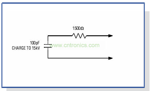 建立。針對不同情形可以用幾種公認(rèn)的模型描述帶電人體,最為通行的模型(圖2)是充電到15,OOOV的100pF電容與1500。電阻串聯(lián)。