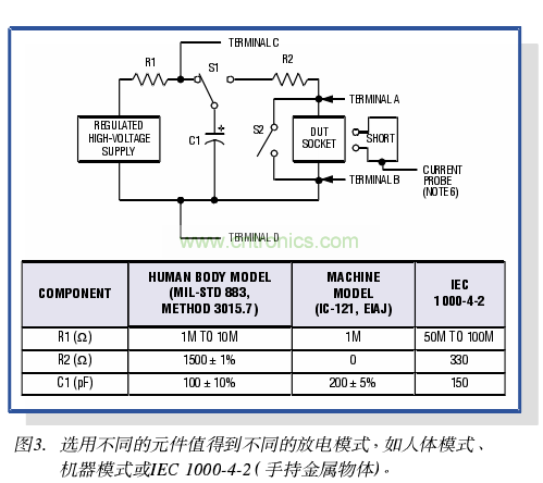 有兩種方法一均符合上述要求一已被設(shè)備制造商廣泛采用,來測試I/O端口的ESD防護(hù)能力(圖3)第一種方法修改自Method 3015.7 > MIL-STD-883它采用了與原來方法相同的電路模型和波形,但只將ESD脈沖施加于器件的I/o引腳。這種方法的口的是模擬已安裝于線路板并運(yùn)行于口標(biāo)系統(tǒng)中的Ic所遭遇的故障電流。