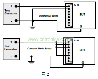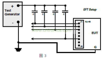 檢查設備的 EFT 免疫力(根據 IEC61000-4-4 標準),與共模雷擊浪涌測試非常相似。在如圖 3 所示比較典型的配置中,所有的導體(或引腳)電容耦合到測試信號發生器的正極和“浪涌”到 GND。如果數據線幾乎沒有差別,線對之間很少有異模能量,但變壓器耦合電容會再次將共模能量以衰減的方式傳輸到驅動端。