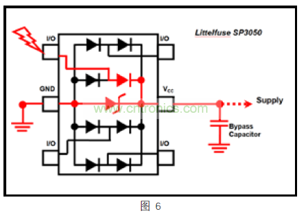 通過連接 SP3050的 VCC 引腳,由于電氣瞬態兩個獨立的放電路徑,如下(圖 6)紅色所示,設計者將更好進行夾緊設計。可以簡單地將它看作一個電阻分壓器,其中瞬態電流通過導向二極管,并選擇了兩條路,一個通過內部 TVS到 GND,一個通過電源或外部旁路電容到 GND。總而言之,第 5 腳連接到電源,將導致更好的夾緊性能,給以太網 PHY 提供更好的整體保護。