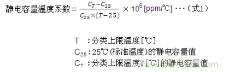 (1)一種是在公共標準中被歸類于種類Ⅰ (Class1)的溫度補償用獨石陶瓷電容器中,使用了二氧化鈦與鋯酸鈣類電介質材料,其靜電容量對溫度幾乎呈現直線性變化。將溫度發生的變化稱為溫度系 數,其數值以每1℃的百萬分之一作為單位(ppm/℃)表示。溫度系數根據基準溫度(IEC,JIS標準中為20℃,EIA標準中為25℃,此處以25℃ 為基準)中的靜電容量值C25與分類上限溫度(最高使用溫度:設計上可連續使用電容器的最高環境溫度)中的靜電容量值CT定義得出。