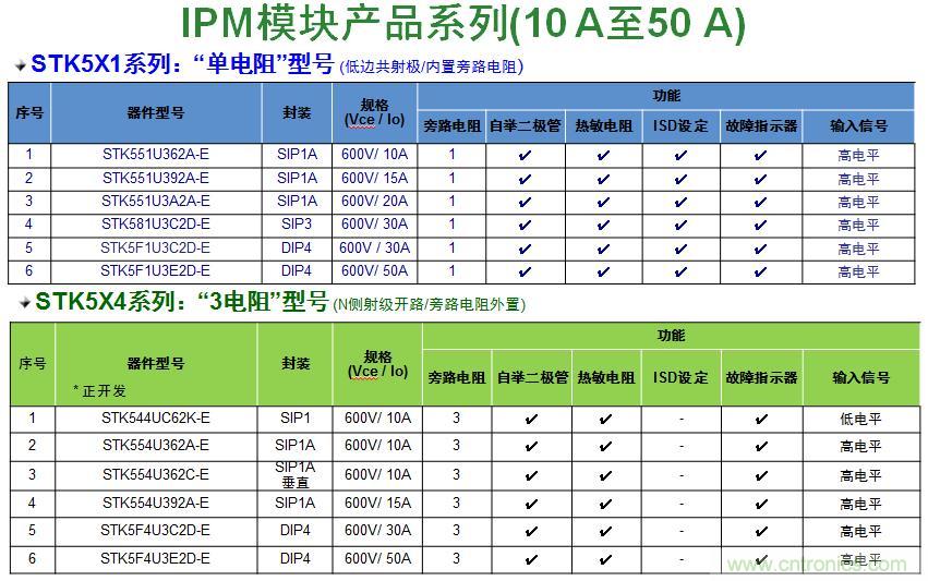 安森美半導體創新的IMST技術可靠且性價比高,同時提供高能效和低噪聲,而基于此技術更進一步的二合一IPM STK57FU/5MFU,由于在單個封裝中集成PFC轉換器和變頻器,大幅減少元器件數量,減少PCB所占空間,降低組裝成本,降低能耗并提升能效。其關鍵特性包括:內置過流保護和過壓保護功能、內置熱敏電阻可監測溫度、能夠使用內置IPM的啟動電路來實現單電源驅動、內置防止上邊/下邊晶體管同時導通的電路,是白家電應用的理想方案。