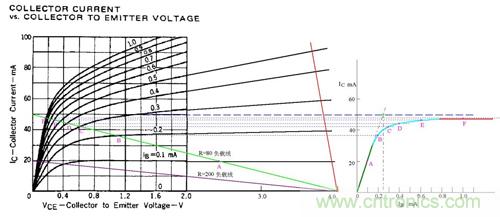 圖中假定電源電壓為4V,綠色的斜線是負載電阻為80歐姆的負載線,V/R=50MA,圖中標出了Ib分別等于0.1、0.2、0.3、0.4、0.6、1.0mA的工作點A、B、C、D、E、F。據此在右側作出了Ic與Ib的關系曲線。根據這個曲線,就比較清楚地看出“飽和”的含義了。曲線的綠色段是線性放大區,Ic隨Ib的增大幾乎成線性地快速上升,可以看出β值約為200。蘭色段開始變彎曲,斜率逐漸變小。紅色段就幾乎變成水平了,這就是“飽和”。實際上,飽和是一個漸變的過程,蘭色段也可以認為是初始進入飽和的區段。在實際工作中,常用Ib*β=V/R作為判斷臨界飽和的條件。在圖中就是假想綠色段繼續向上延伸,與Ic=50MA的水平線相交,交點對應的Ib值就是臨界飽和的Ib值。圖中可見該值約為0.25mA。