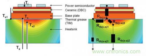 其中Tc為芯片的外殼溫度,PD為芯片在該環境中的耗散功率,Tj表示芯片的結點溫度,目前大多數芯片的結點溫度為150℃,Rjc表示芯片內部至外殼的熱阻,Rcs表示外殼至散熱片的熱阻,Rsa表示散熱片到空氣的熱阻,一般功率器件用Rjc進行計算即可。