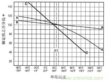 如圖所示為溫度降額曲線,以曲線A為例,在溫度為80℃時(shí),Tf為0.75。因此,若不考慮其他特性的影響,對(duì)3A的應(yīng)用,至少應(yīng)選擇4A(3/0.75=4)的保險(xiǎn)絲。