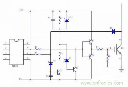 所以IGBT的短路保護一般是配合過載保護的,下面是一個TLP250增加慢降柵壓的驅動和短路保護的應用電路圖:
