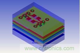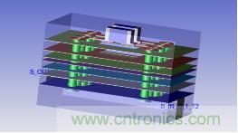 這里我們以0402的AC耦合電容為例進(jìn)行仿真,一端Botm層通過換層過孔連接Top面的AC耦合電容,另外一端通過過孔再連接到Art12層,這里我們分別仿真3種情況;電容掏空到GND02層,X方向掏34mil,Y方向掏66mil(Case1)。模型建好后的3D效果圖如圖4所示。