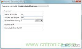 模型生成好后,電容出線的兩端會自動生成Wave Port,所以不需要你手動去設(shè)置Port,這里還有一點(diǎn)就是材料的參數(shù)以及孔徑需要你去設(shè)置,材料參數(shù)設(shè)置因?yàn)槭乔胺抡妫杂肈jordjevic-Sarkar Model Input簡單的頻變模型(圖7),只需要設(shè)置一個(gè)頻點(diǎn)的Dk和Df值就可以求解寬帶的頻變曲線。具體設(shè)置界面如下所示,這里我們板材選用FR-4,Dk和Df的值選擇1GHz頻點(diǎn)。