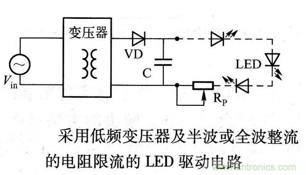 該電路的優點是:電路簡單、成本低。缺點是:體積大、電壓驅動模式,LED亮度會隨著供應電壓的變化而有所改變;無法提供恒流輸出;突波電流較大。這種LED驅動電源的電路結構非常簡單,只需要一個低頻變壓器、整流器、濾波電容,以及一個用于調整亮度的可變電阻。串聯LED的數目主要由變壓器的匝數比所決定。一旦選用變壓器的匝數比固定之后,若要得到一樣的亮度9就很不容易再改變LED的數目。