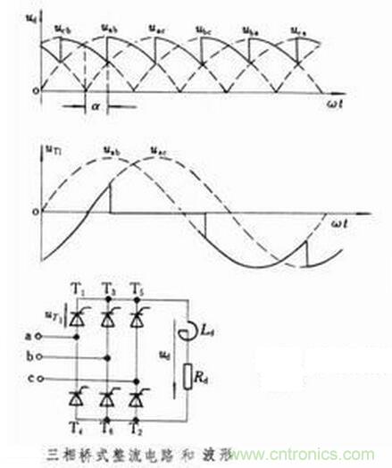 采用三相全控橋式整流電路時,輸出電壓交變分量的最低頻率是電網頻率的6倍,交流分量與直流分量之比也較小,因此濾波器的電感量比同容量的單相或三相半波電路小得多。另外,晶閘管的額定電壓值也較低。因此,這種電路適用于大功率變流裝置。