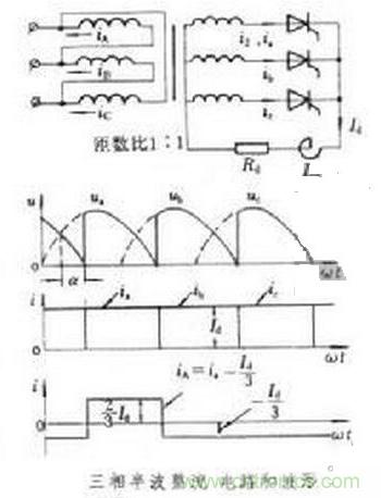 由圖可見,變壓器次級繞組電流i2可以分解成直流分量i2=和交流分量i。由于直流分量i2≈只能產生直流磁通勢,所以它無法影響初級電流作相應變化。而交流分量 i將通過變壓器的磁耦合反映到初級電流中去。這樣,初、次級電流有效值分別為I1=Id/3、I2=Id/。在α=0°和不考慮電網電壓波動等情況下,得S2=1.48Pd、S1=1.21Pd、S=1.345Pd, 其中Pd為整流功率。在三相橋式電路中,次級無直流分量電流,所以初、次級電流是波形相同的交流電,故S=1.05Pd,可見橋式接線時變壓器利用率提高。