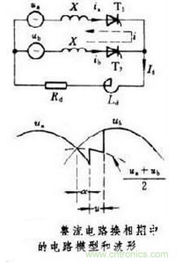 ③重疊導電現象和電壓降:圖5所示為變壓器漏抗存在時對整流電路波形的影響。當T1處于導通狀態,給直流側提供電流Id時,觸發T2,若ud<ub,則T2變為導通狀態。但由于交流側存在漏感,T2中的電流并不立即變為Id,T1中的電流也不立即降為零,因此出現T1和T2同時導通的狀態,這種狀態稱為換相重疊現象,這段時間以相角計算,稱換相重疊角,用u表示。在重疊期中,輸出電壓為(ud+ub)/2,與不考慮漏抗時相比,輸出電壓降低了(ub-ud)/2。重疊期內直流電流一定的話,則T1、T2回路中流過環流i,這時α相電流id=Id-i將逐漸減小,而b相電流ib=i,當ib增加到Id時,id就等于零,這樣就完成了換相過程。關于電流i,2&TImes;di/dθ=ub-ud式成立,由于在控制角α處i=0,在(α+u)處i=Id,故有2&TImes;Id=(ub-ud)·u。因此,交流電流在一周期內換相一次引起的平均輸出電壓降為dx=XId/2π。重疊角u隨α不同而不同,但電壓降是與α無關的常數。在三相橋式電路中,由于一周內換相6次,換相壓降nx=6XId/2π,式中X是每相的電抗。