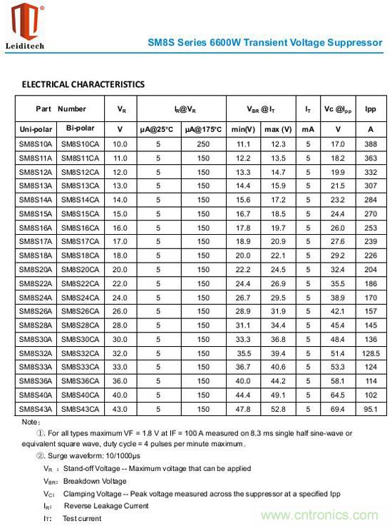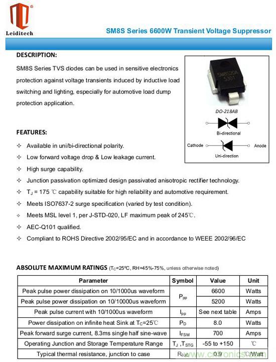 從規格書上來看,SM8S系列產品的功率都在6600W,通過的峰值電流由于電壓不同而變化,電壓越大,電流越小。先列出規格書來看下: