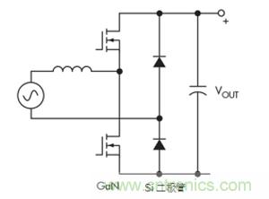 一種替代方案是連續導通模式圖騰柱拓撲。這種拓撲結構充分利用了GaN的所有關鍵特性,最終導致尺寸更小、工作頻率更高的設計(圖4)。GaN的零反向恢復對于實現該拓撲特別重要。