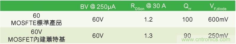 當只有優化Qrr和VF,diode才能提高系統總體性能時,集成肖特基二極管的新60V MOSFET是一個正確選擇。圖3列出了標準MOSFET和集成肖特基的功率開關的主要電參數(兩款產品的BVDSS和芯片尺寸相同)。
