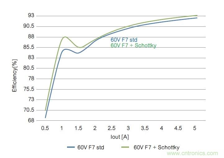 在兩個拓撲內,60V內置肖特基二極管的器件在整個電流范圍內性能表現更好,從而提高了系統總體性能。