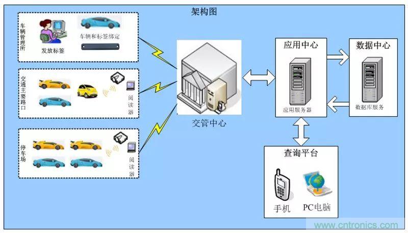 正是由于電子車牌相比傳統(tǒng)車牌有這么多的優(yōu)勢和特點(diǎn),可以預(yù)見在不久的將來,機(jī)動車輛將會逐步使用帶有電子標(biāo)簽的電子車牌替代目前的傳統(tǒng)車牌,這樣一來,從車輛前端的電子車牌,到后端的車牌識別、數(shù)據(jù)傳輸、車輛管理、數(shù)據(jù)存儲、終端查詢等整個平臺的構(gòu)建和發(fā)展前景都是十分廣闊的,圖2是整個平臺組成架構(gòu)的示意圖。