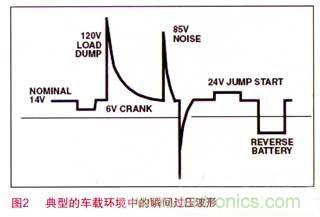 車載環境中電源電路中的瞬間過壓包括:負載突降(Load Dump)、跳變開始(Jump Start)以及各種各樣的電壓噪聲。如圖2所示。其中拋負載過壓是車載環境中最嚴重的瞬間過壓,在12V車載系統中,其瞬間過壓可達125V。