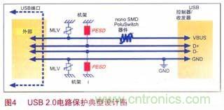 隨著USB/IEEE1394通信速率的增加,電路日趨小型化和敏感化,對電路瞬態的保護就顯得更為重要。每當連接和斷開PND,電路都會受到瞬態過電壓/過電流的沖擊,故需要在電源和地上分別抑制瞬間過壓。由于鉗位而不會引起供電中斷,且價格較低,MLV常被采用。為滿足USB和IEEE1394接口規范要求,PolySwitch器件通常用于防止USB電源線上因過電流造成的設備損壞,是即插即用型應用設備的理想選擇。
