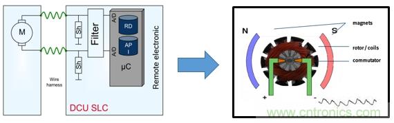 電機(jī)有磁極、轉(zhuǎn)子線(xiàn)圈、換向器組成。根據(jù)右手定律轉(zhuǎn)子線(xiàn)圈通電后再磁極磁場(chǎng)的作用下產(chǎn)生運(yùn)動(dòng)。運(yùn)動(dòng)到磁場(chǎng)邊緣是磁場(chǎng)變?nèi)酰妱?dòng)勢(shì)減小,電流增大。換向器改變轉(zhuǎn)子線(xiàn)圈的電流方向,重新進(jìn)入磁場(chǎng)電動(dòng)勢(shì)增大,電流減小。轉(zhuǎn)子線(xiàn)圈不斷轉(zhuǎn)動(dòng)、電動(dòng)勢(shì)和電流不斷變化,從而紋波不斷產(chǎn)生。所以紋波是電機(jī)的固有特性,通過(guò)計(jì)算紋波的個(gè)數(shù)就能計(jì)算出轉(zhuǎn)子換向的次數(shù),就能計(jì)算出窗戶(hù)的相對(duì)位置,結(jié)合時(shí)間就能得出電機(jī)的轉(zhuǎn)速。